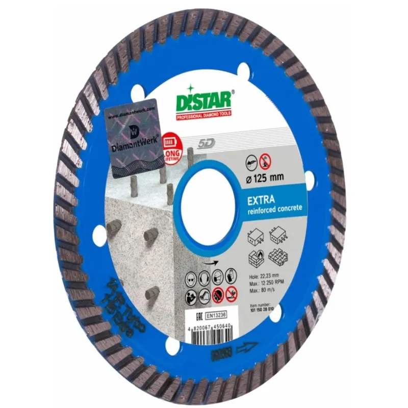 Диск алмазный Distar EXTRA 125*22,2 мм Extra классик  Алмазный круг DISTAR 125 Extra это стандартный диск для ручных инструментов, наружным диаметром 125 мм. Посадка на УШМ осуществляется через отверстие диаметром 22,23 мм. Используется в быту и строительстве для резки бетона, высокоармированного бетона, тротуарной плитки и армированного бетона. Можно использовать для работы с кирпичом. Диаметр, мм - 125 Тип диска - алмазный Посадочный диаметр, мм -22.2 Толщина, мм - 2,2 Тип - по железобетону Тип реза - сухой Высота алмазного слоя, мм - 8 Тип - по бетону, кирпичу По абразивным материалам-нет