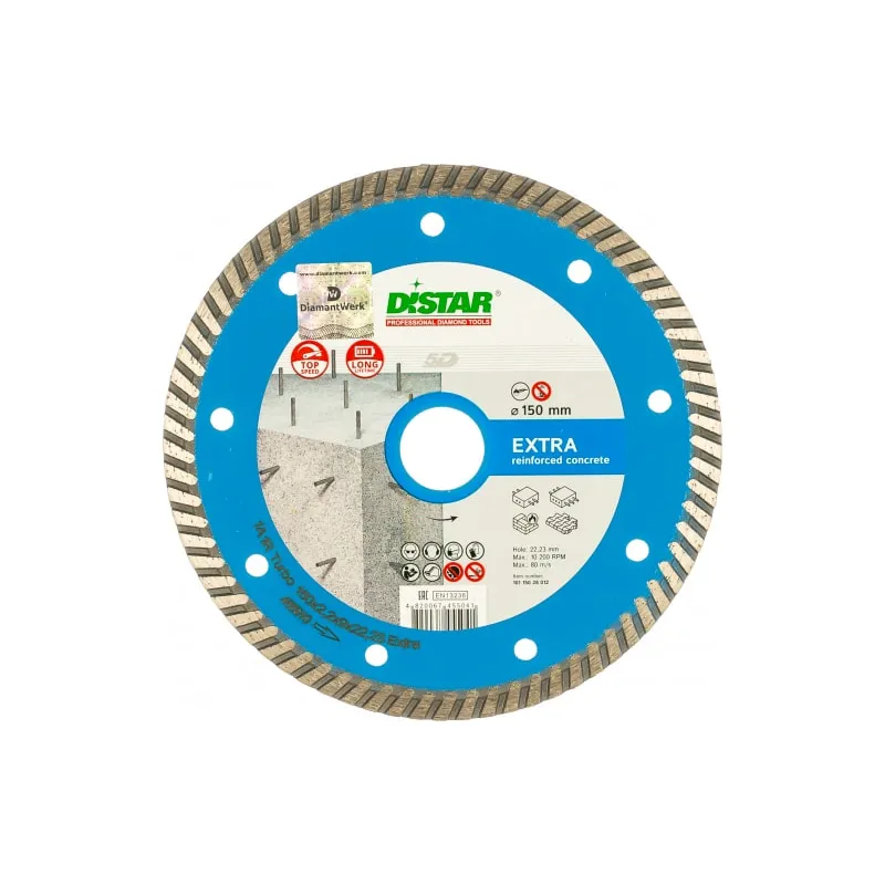 Диск алмазный турбо по армированному бетону Extra для DiStar  (150х22.2 мм) 10115028012 Алмазный круг 150 Turbo Extra это стандартный диск для ручных инструментов. Используется в быту и строительстве для резки бетона, высокоармированного бетона, тротуарной плитки и армированного бетона. Диаметр  150 мм Тип диска алмазный Вид диска турбо Посадочный диаметр 22.2 мм Толщина 2.2 мм Тип  по железобетону Тип реза  сухой (с СОЖ и без) Высота алмазного слоя 8 мм Тип по бетону, кирпичу