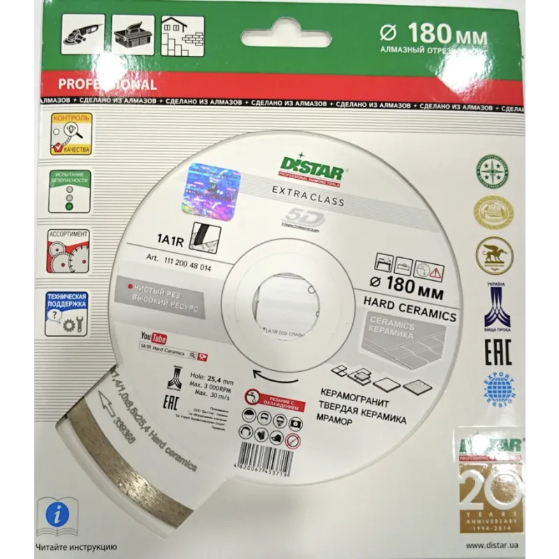 Алмазный диск Дистар 150х25,4м керамогранит белый Диск алмазный Дистар 150x25,4мм подходит для бытовых, ремонтных, а также декоративных работ. Выполняет резку таких материалов как: кварцит, керамическая плитка, мраморные мягкие породы, керамогранит, рельефная глазурь. Высота алмазного слоя составляет 8,0мм, а толщина 1,4мм Материал обработки - Керамика, Мрамор, Керамогранит Диаметр посадочного отверстия, - 25.4 мм Диаметр диска - 150 мм Толщина - 1.4 мм