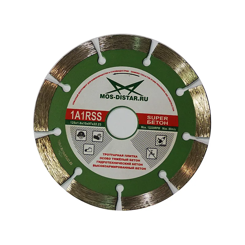 Алмазный диск Standard по бетону  125х22 мм  Диск алмазный   используется при сухой резке бетона, мрамора и т.д. Диск применим для сухой резки кирпича, бетона, асфальта или мрамора.  Посадочное отверстие 22.23 мм Страна производства Китай Ширина сегмента 10 мм Количество сегментов 9 шт. Тип реза Сухой Диаметр Ø 125 мм Бетон Да Толщина диска 2 мм Бордюрный Камень Кирпич  Огнеупорный Кирпич Твердый Кирпич