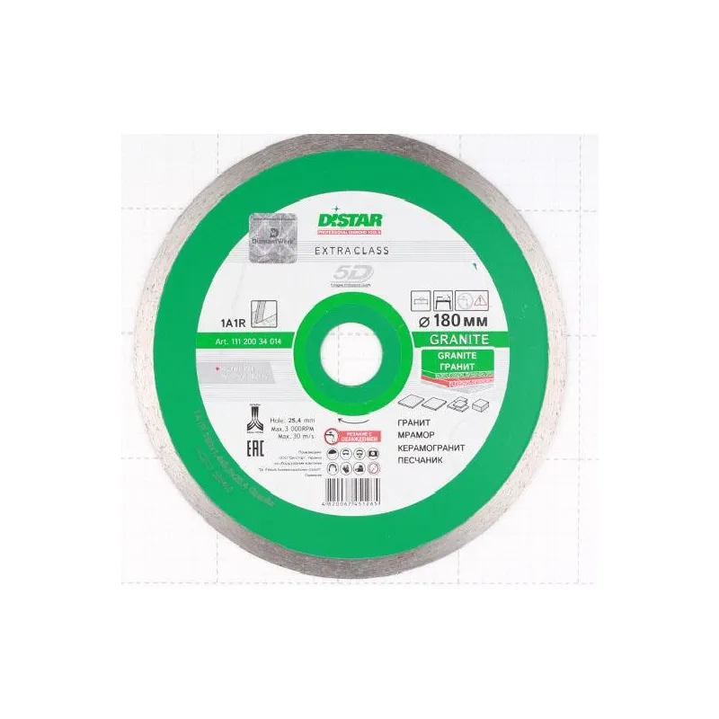 Диск алмазный сплошной по граниту Granite (180х1.4х25.4 мм) DiStar 11120034014 специально для стационарного оборудования и плиткорезов с допустимым наружным диаметром круга в 180 мм Предназначен для применения в быту и строительстве, диаметр посадочного отверстия соответствует 25,4 мм.