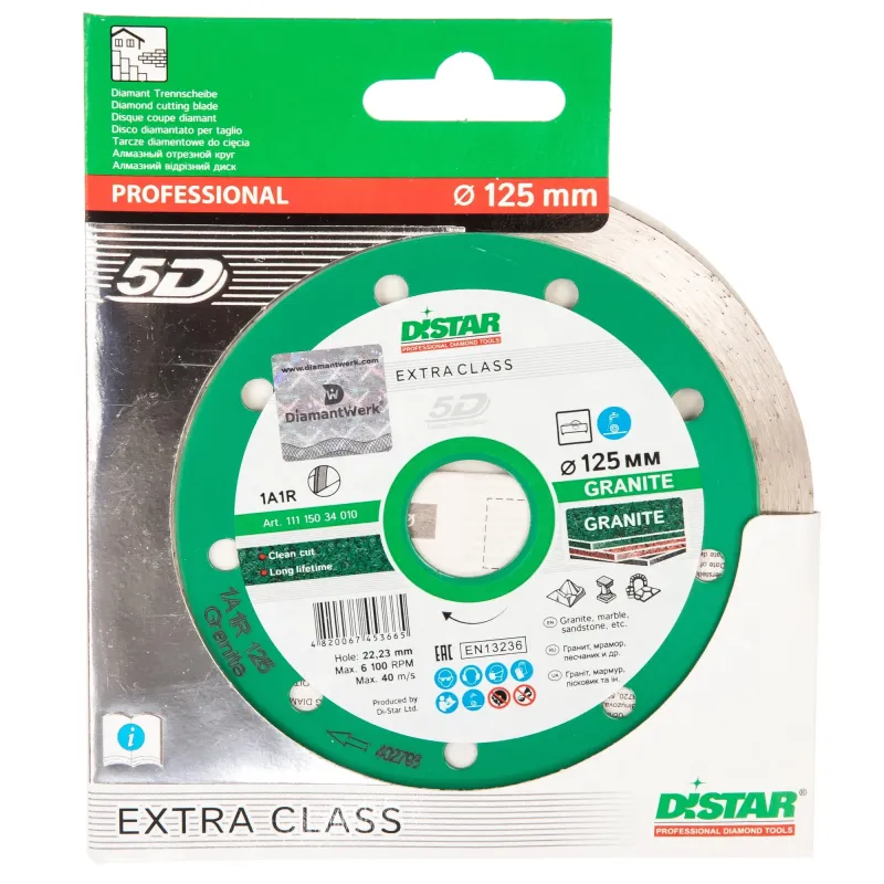 Диск алмазный сплошной по граниту GraniteDiStar  (125х1.4х22.2 мм) 11115034010 Диск алмазный сплошной Distar Granite 125х1.4х22.2 предназначен для высококачественной и эффективной резки гранита, обеспечивая чистый и точный рез без сколов и повреждений материала.  Диаметр 125 мм Тип диска алмазный Вид диска сплошной Посадочный диаметр 22.2 мм Толщина 1.4 мм Тип по граниту Тип реза мокрый (с СОЖ) Высота алмазного слоя 8 мм Тип по граниту, мрамору, песчанику
