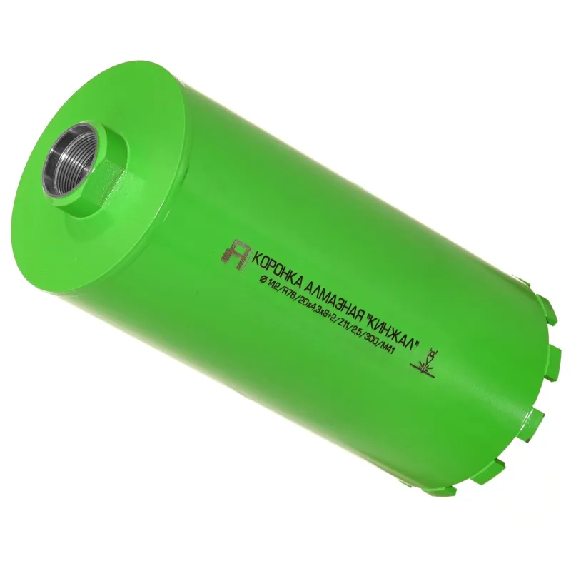 Диаметр: 142 мм Хвостовик: М41 Ресурс: уточняйте у менеджера Режим работы: сухой Лазерная приварка сегментов: да Количество сегментов: 11 Высота сегмента: 10 мм Радиус сегмента: R76 мм Рабочая длина корпуса: 300 мм Толщина корпуса: 2 мм Базовые материалы: Бетон (все типы), кирпич Серия сегмента: КИНЖАЛ Производитель: АЛАТОН Страна: РОССИЯ Алмазные коронки «Кинжал», длина 300 мм